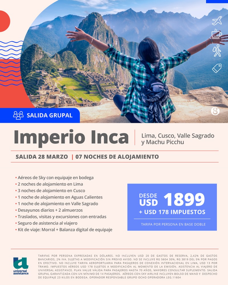 Esta salida grupal ofrece una experiencia completa por los destinos más emblemáticos de Perú, combinando cultura, historia y naturaleza en un recorrido cuidadosamente diseñado. El itinerario incluye estadías en Lima, Cusco, Valle Sagrado y Aguas Calientes, permitiendo explorar en profundidad cada región, junto con excursiones guiadas y entradas incluidas a los principales atractivos, como Machu Picchu. El programa contempla vuelos con equipaje, traslados, alojamiento, desayunos y almuerzos seleccionados, además de asistencia al viajero y kit de viaje, brindando comodidad y tranquilidad durante toda la experiencia.